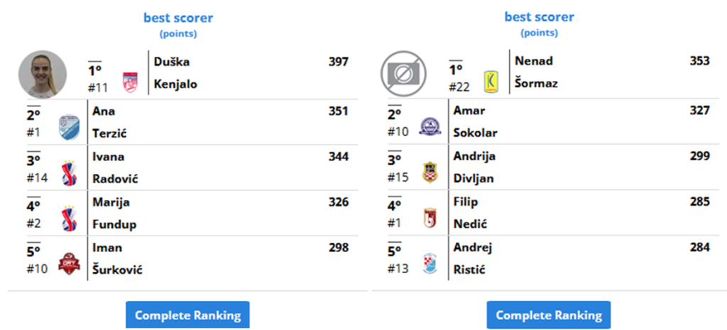 Najbolji poenteri Premijer lige u sezoni 2025/2026 bili su: Nenad Šormaz, odbojkaš OK “Modriča Novoprom”, sa 353 poena; dok je u ženskoj konkurenciji titiulu najbolje poenterke odnijela Duška Kenjalo, odbojkašica OK “Kula Gradačac”, sa 397 poena.